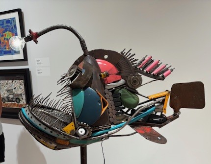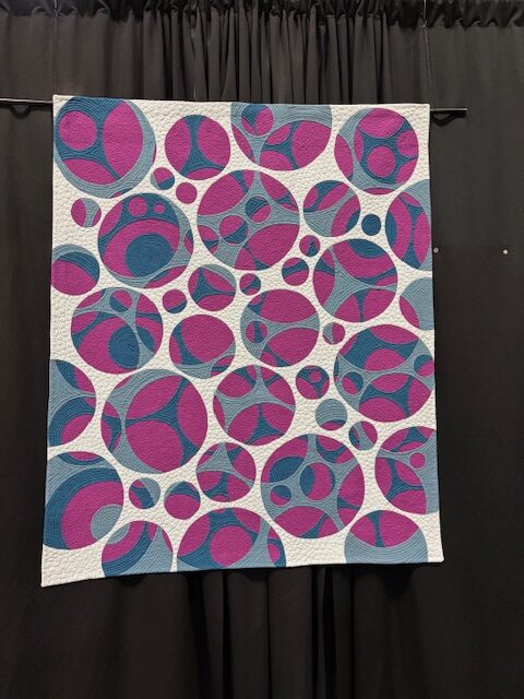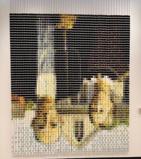 Moring Meadow This work is 19″ w X 12 t. I read about using your sewing machine on soda cans and so I tried that. The centers of the tall purple flowers are that experiment.