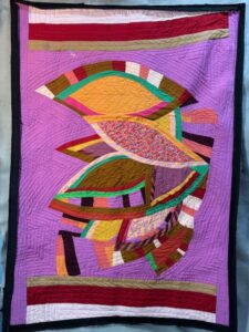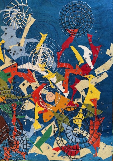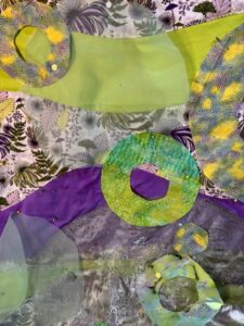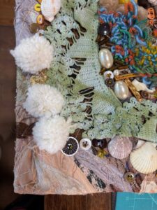 Rework of Autumn Tide Pool #3. I learned that this pieces was too heavy to hang from a sleeve in the normal way when I put it in my solo show in June. I am finally getting it stretched and stitch to foam core now. Liz gave me a batch of her old foam core so that has been a push to do the work. I need to stitch through the buttons and foam core to make it squire. I am about one forth of the way along on that step now.