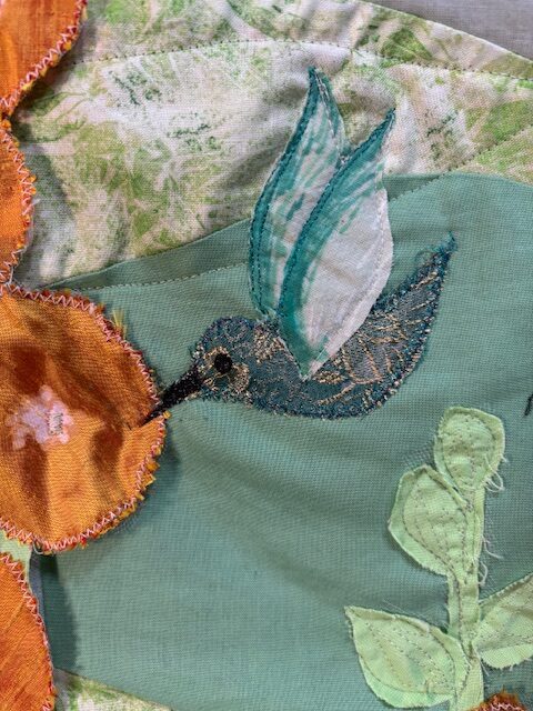 Hollyhocks and Hummingbirds It took several attempts to get wings that I liked for my birds on this project. I have seven stitched to the base now. I can see the completion of this project is coming soon.