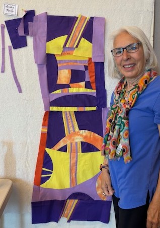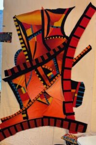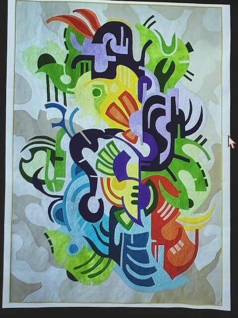 I had friends in other classes doing other things.   Susan was in Paula Kavairk’s  class.   This is her project.  I had given her old work to share with the class for cut up and she used one of my pieces here.