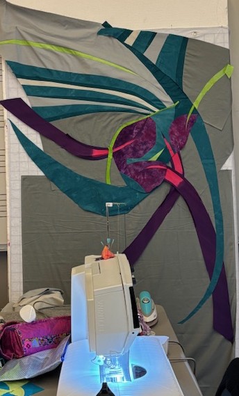 Souring Sparrows   This is  a second project that I stated in Independent Studio.     I really learned that cutting a four color stencil pattern is much harder to register that I expected.    I am trying to  quilt in what I imagine  might be the wind patterns  on this quilt.
