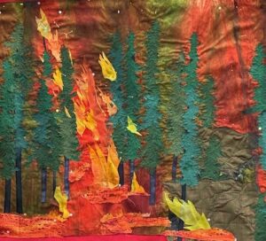 Progress Report:  Canadian Wildfires This quilt is 35″ w X 42″ l.   I started the work in Quilting By the Lake in Independent Studio.   There are still over 700 wildfires burning there.