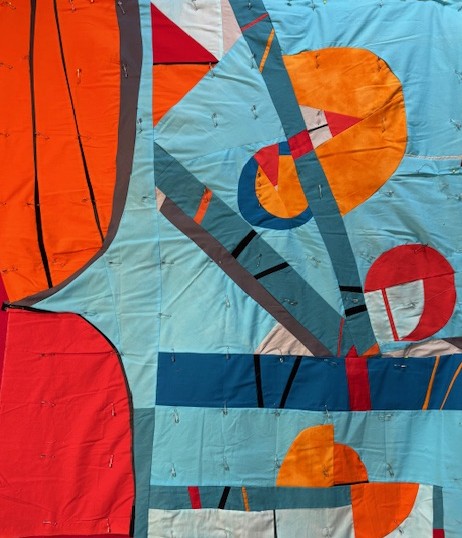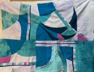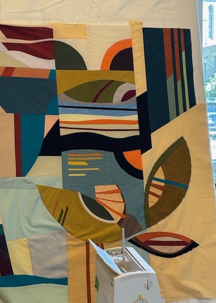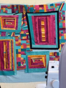 Progress Report: Lap #17   I started this pieces before QBL and now I have done most of the stitch in the ditch work.  I used fabric I printed in Pat Pauly’s class as my starting point for this work.