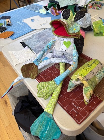 Susan was jut home from another retreat doing three D work using paper and cardboard that she hand stitched together.
