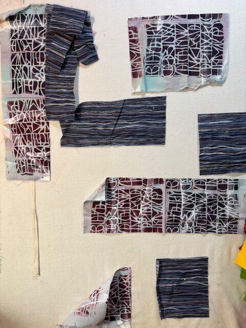 Lap # 19    This is just the beginning of this project.    The  printed  fabric with  strong dark with lines is some  I printed  in the past.