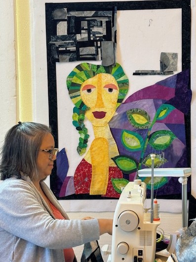 Victoria shared her newest piece with a great mix  of new fabrics and old work  cuts.    She introduced the use of Cola pens to make marks too.   ( the thick black lines)