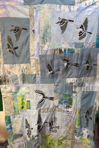 Progress Report:  Sparrows  This piece is 38″wX 52″ l.     I am pleased with the final result here.   I tried to use the quilting to show the wind action around the birds.