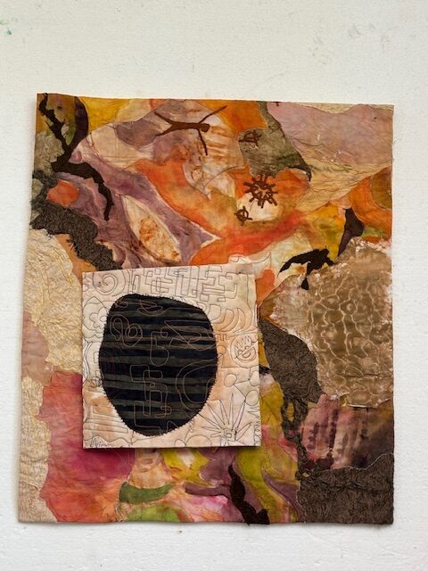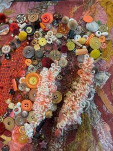 Rework of Autumn Tide Pool #3.  I learned that this pieces was too heavy to hang from a sleeve in the normal way when I put it in  my solo show in June.  I am finally getting it stretched and stitch to foam core now.  Liz gave me a batch of her old foam core so that has been a push to do the work.   I need to stitch through the buttons and foam core to make it squire.    I am about one forth of the way along on that step now.